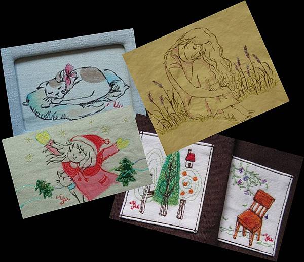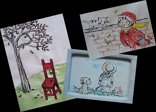 雖然我一直很喜歡像速寫般簡潔的單色線條,但偶爾還是想玩點顏色作些變化,將彩線層層疊疊、加上顏料、羊毛氈、縫上珠珠、布片、鍛帶、金線等....不斷嘗試更多組合與可能性,這幾天為了寫這幾篇文翻找圖檔,才驚覺繡過的圖案早就超過上百個了,對於這點覺得有點不可思議哩〈突然有點佩服自己?〉呵呵呵.....
